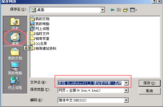 第二步:在电脑里选择一个路径。本文以存放在桌面为例。单击“桌面”,并在“文件名”框中,键入网页名称。